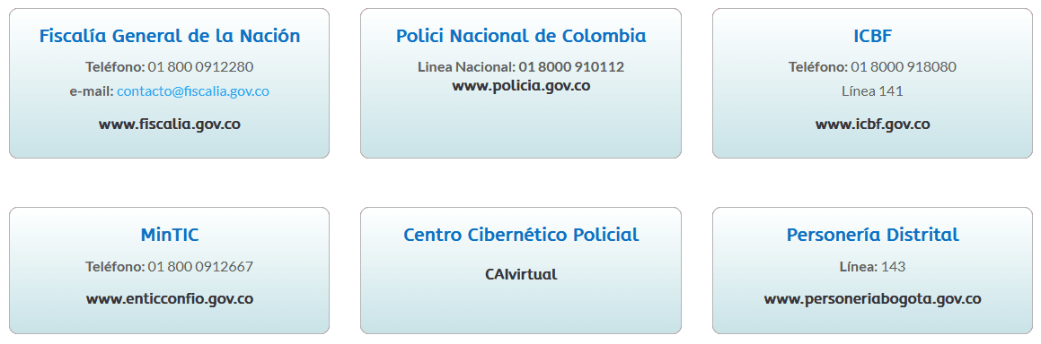 Para formular denuncias contra contenidos de pornografía infantil o páginas electrónicas en las que se ofrezcan servicios sexuales con menores de edad, existe una iniciativa ¡Te protejo: Canal de Denuncia Virtual- En TIC Confío! es la campaña del Ministerio de Comunicaciones para que todos los colombianos comprendamos el significado de la prevención de la pornografía infantil y juvenil en Internet.